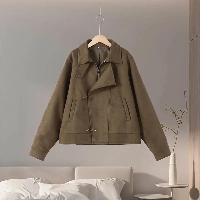 Vintage Suede Toggle Jacket Men Casual Solid Lapel Asymmetry Full Sleeves Short